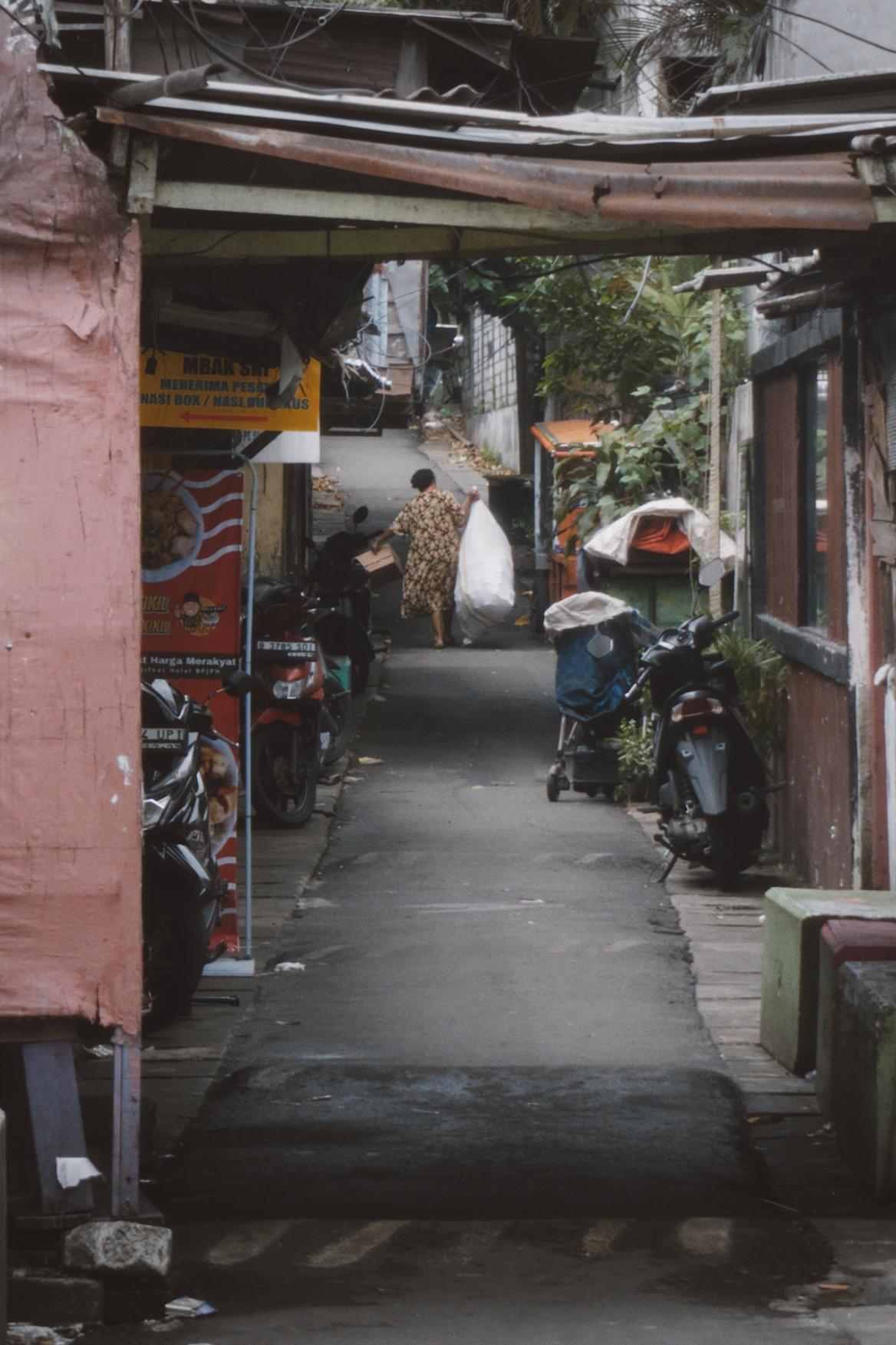 April 3rd, 2025—A figure moves through the narrow path—their work a constant—carrying the city’s burdens through a tight passage.